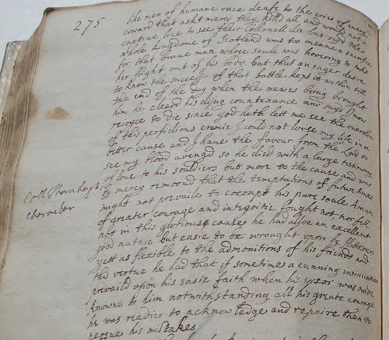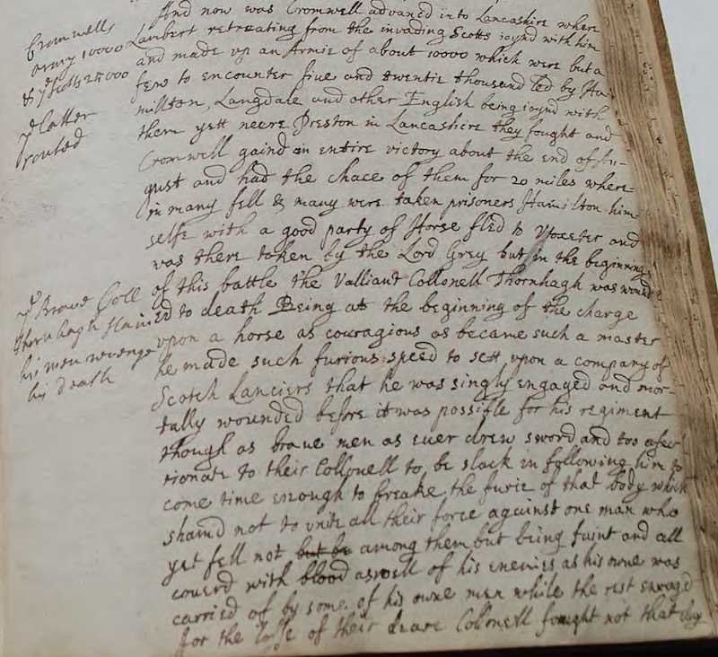 [I]n the beginning of this battle the Valliant Collonell Thornhagh was wounded to death. Being at the beginning of the charge upon a horse as couragious as became such a master, he made such furious speed to sett upon a company of Scotch Lanciers that he was singly engaged and mortally wounded before it was possible for his regiment, though as brave men as euer drew sword and too afectionate to their Collonell to be slack in following him, to come time enough to breake the furie of that body, which sham’d not to unite all their force against one man; who yet fell not among them, but being faint and all cover’d with blood, as well of his enemies as his owne, was carried off by some of his owne men, while the rest, enrag’d for the losse of their deare Collonell, fought not that day like men of humane race. Deafe to the cries of euery coward that askt mercy, they kill’d all, and would not a captive [should] live to see their Collonell die, but sayd the whole kingdome of Scotland was too meane a sacrifice for that brave man, whose soule was hovering to take her flight out of his body, but that an eager desire to know the successe of that battle kept it within till the end of the day; when, the newes being brought him, he clear’d his dying countenance, and sayd, “I now rejoyce to die, since God hath lett me see the overthrow of this perfidious enemie; I could not loose my life in a better cause, and I have the favour from the Lord to see my blood aveng’d.” So he died, with a large testimony of love to his souldiers, but more to the cause, and was by mercy remoov’d, that the temptations of future times might not prevaile to corrupt his pure soule. A man of greater courage and integritie fought not, nor fell not in this glorious cause. He had alsoe an excellent good nature, but easie to be wrought upon by flatterers, yett as flexible to the admonitions of his friends; and this vertue he had, that if sometimes a cunning insinuation prevail’d upon his easie faith, when his error was made knowne to him, notwithstanding all his greate courage, he was readier to acknowledge and repaire than to persue his mistakes.